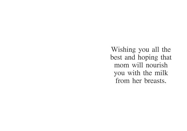 Includes inside text “Wishing you all the best and hoping that mom will nourish you with the milk from her breasts.”